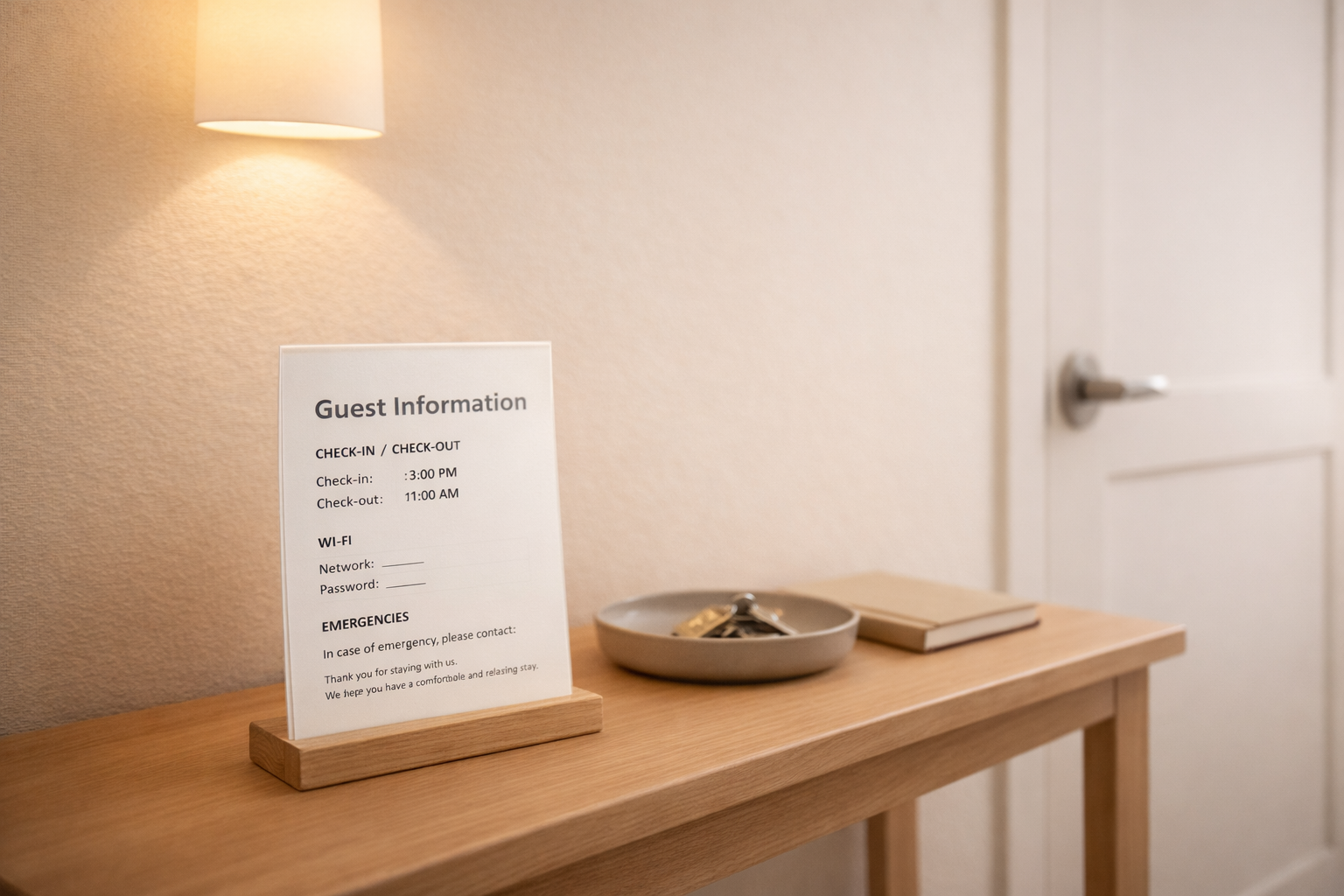 A warm, minimal welcome page that sets the tone of the stay.